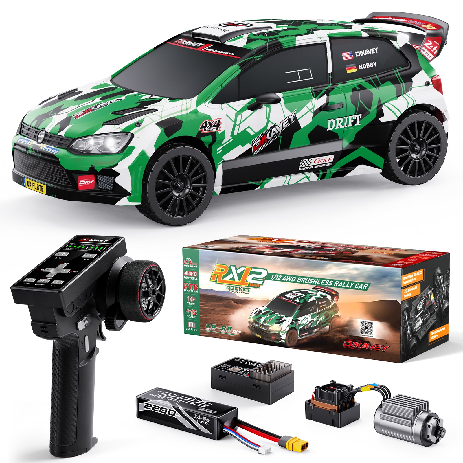DIKAVEY 1/12 Scale RTR 4WD Brushless RC Rally Car | RX12(Green)
