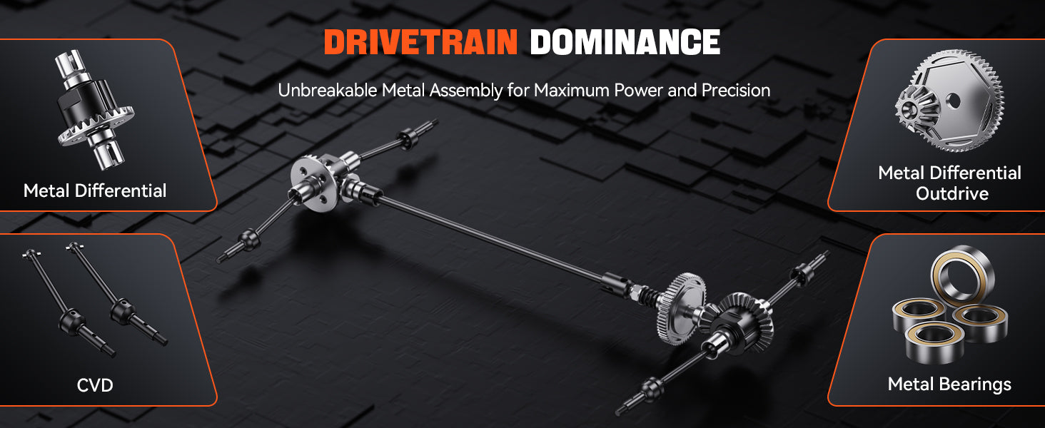 - INDUSTRIAL-GRADE DURABILITY & PRO-LEVEL CONTROL:Boasting a full-metal drivetrain (CNC 59TC steel differential, oil-damped suspension, steel CVDs) plus a 6061 aluminum chassis and powder-metallurgy gears, it delivers max 4X4 power. The 2mm reinforced PC shell, front anti-collision design, and cooling system stand up to high-impact crashes.Protective bumper, sealed diffs, and a center slipper clutch ensure stable drifting, less rollover risk, and fewer repair headaches.