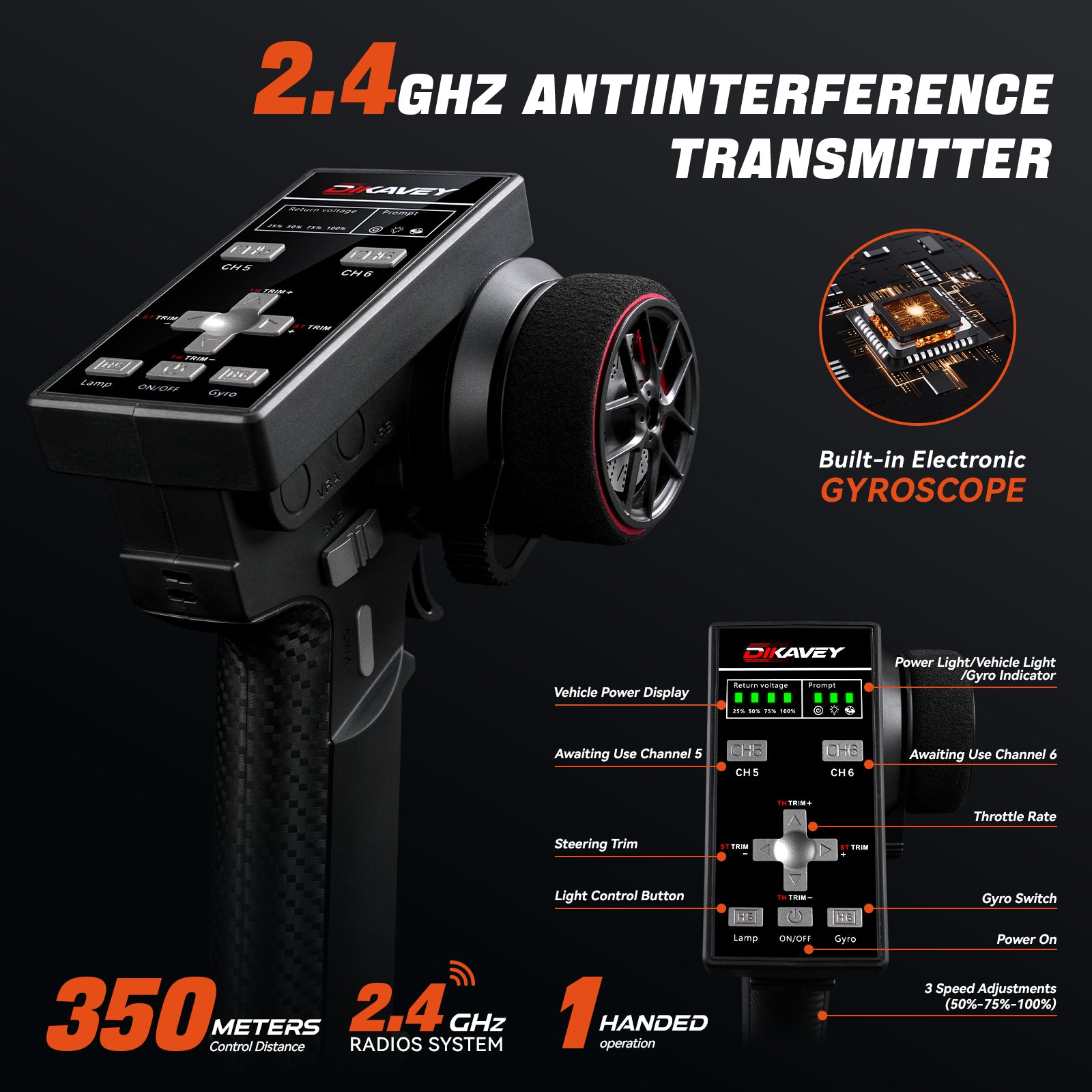 - 2.4 GHZ TRANSMITTER:The gyro guarantees precise high-speed straight lines, smooth turn corrections, and easy dynamic handling—even delivering gentle tail flicks for that pro-level feel. The transmitter (350-meter range) includes 3-speed modes, lighting controls, and gyro-assisted drifting to minimize tail-swinging, so you stay in control.