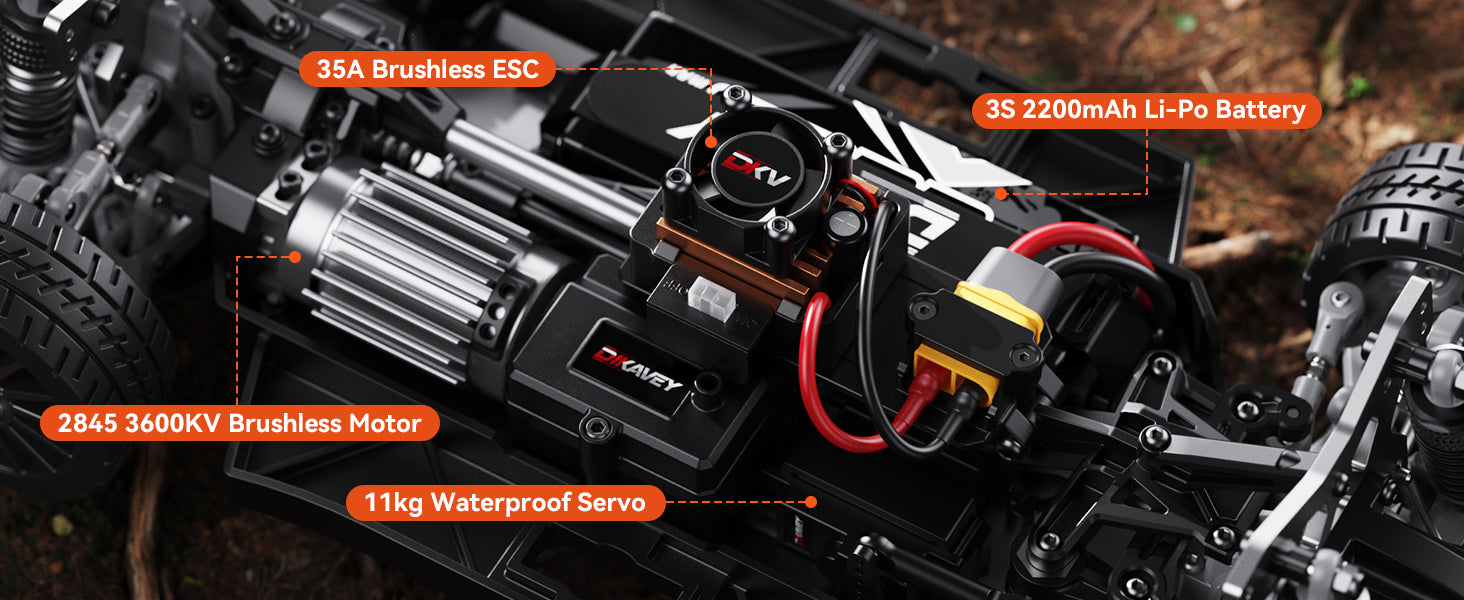 - EXCEPTIONAL HIGH-SPEED PERFORMANCET:his brushless RC rally car features a 35A brushless ESC and Rocket 2845 3600KV brushless motor—both paired with dedicated cooling fans and metal heatsinks to prevent overheating. Powered by the included 3S 2200mAh LiPo battery, it hits speeds up to 80 km/h (≈50 mph) for an adrenaline-pumping, race-ready driving experience.
