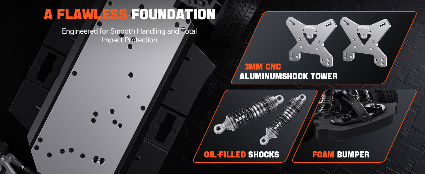 - INDUSTRIAL-GRADE DURABILITY & PRO-LEVEL CONTROL:Boasting a full-metal drivetrain (CNC 59TC steel differential, oil-damped suspension, steel CVDs) plus a 6061 aluminum chassis and powder-metallurgy gears, it delivers max 4X4 power. The 2mm reinforced PC shell, front anti-collision design, and cooling system stand up to high-impact crashes.Protective bumper, sealed diffs, and a center slipper clutch ensure stable drifting, less rollover risk, and fewer repair headaches.